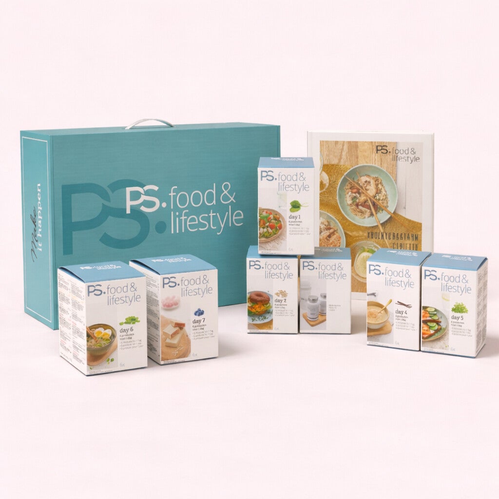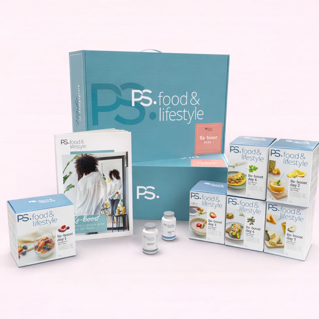 Je streefgewicht behouden blijft soms een uitdaging. Verleidingen liggen dagelijks op de loer. Met het nieuwe Re-Boost 14 dagen pakket van PS. food & lifestyle help ik jou weer grip te krijgen op een gezonde leefstijl. Het pakket bevat twee weekmenu’s, aangevuld met 14 makkelijke recepten en boodschappenlijstjes.